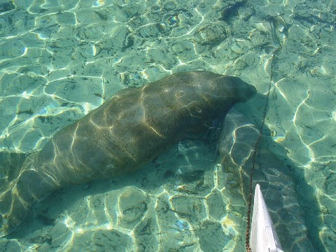 Now I can set the manatees free from their cold, stainless steel camera world. Here's the baby manatee that took a liking to us playing with our anchor line:
